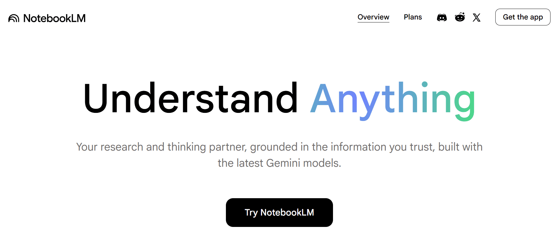 NotebookLM is Google's AI-powered research assistant. It lets you upload sources like PDFs and websites, then generate study guides, briefing docs, and source-grounded outputs from those materials. Google highlights its use for mastering subjects and creating tailored study materials from your sources.